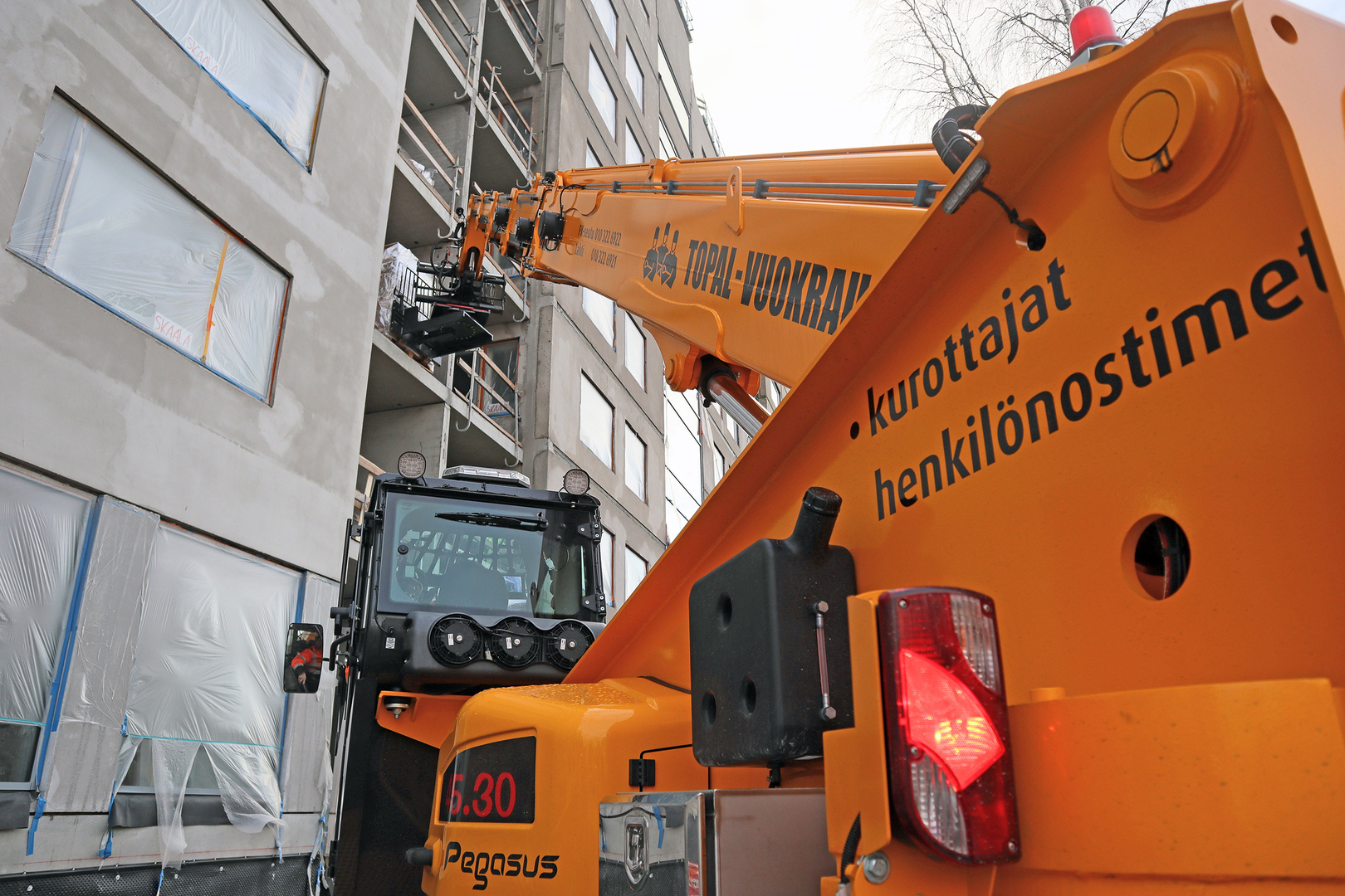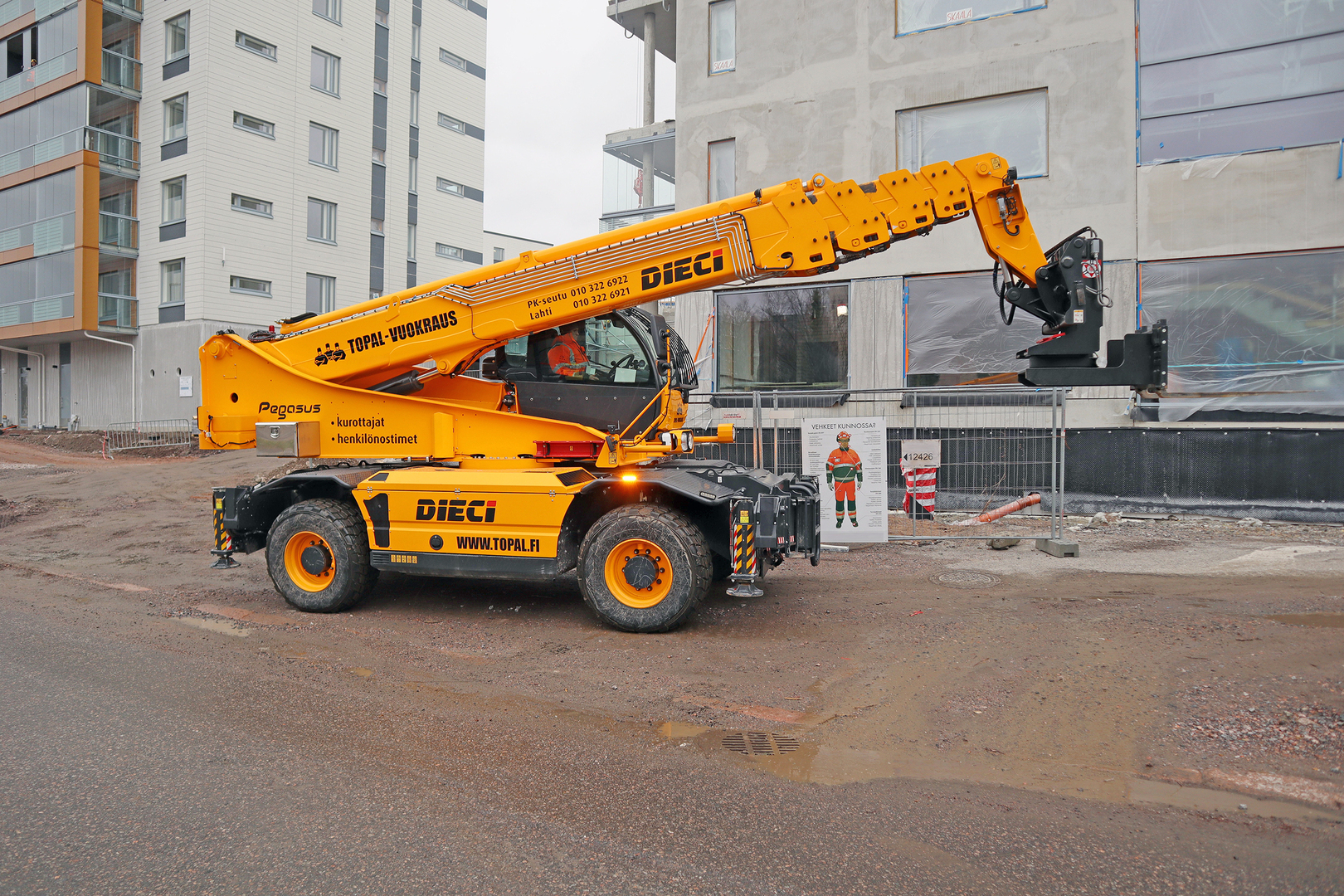 Lahtelainen Topal-Vuokraus ky vuokraa nostolaitteita ympäri Suomen. Pääsääntöisesti koneet vuokrataan ilman kuljettajaa, mutta suurimmat kurottajat menevät työmaalle konevuokraamon oman kuljettajan ohjastamina. Kävimme katsastamassa asuinrakennustyömaalla Espoossa, miten Topalin suurin kurottaja, Dieci 45.30 pärjäilee ahtaissa paikoissa.