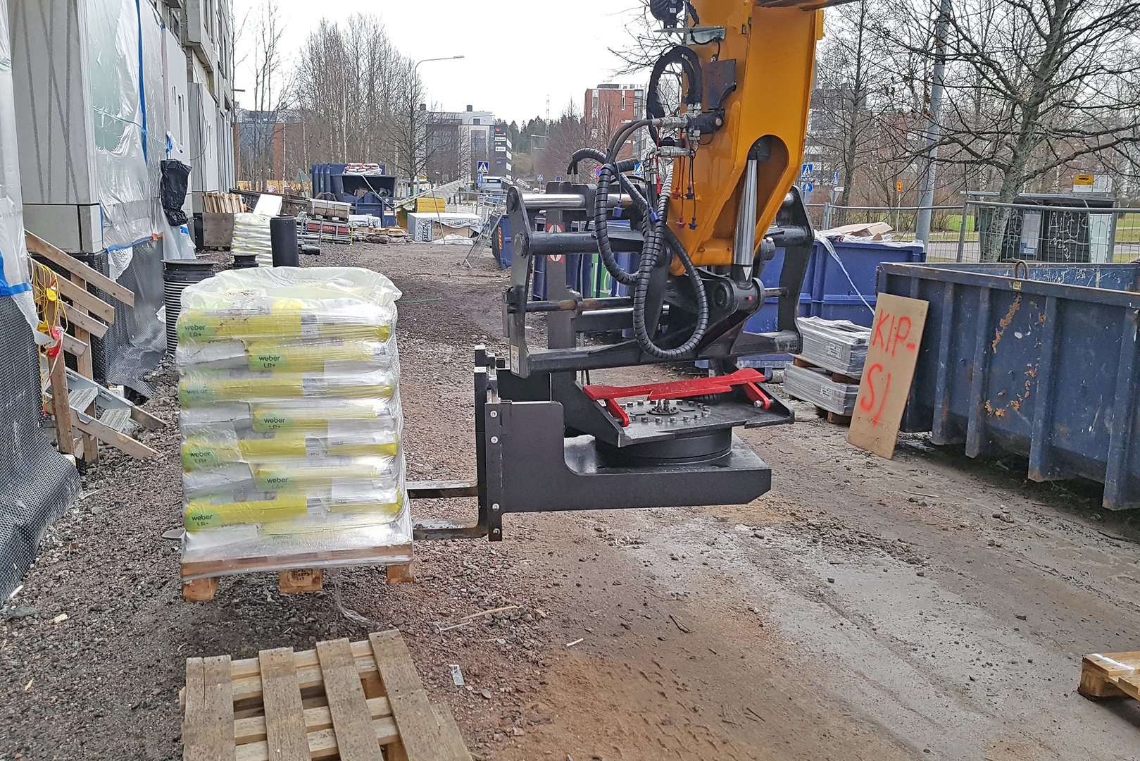 Ja sitten kun nostojen aika koittaa, voidaan lavat taas poimia kyytiin yhdessä paikassa seisten teleskooppia hyödyntäen. Koneen siirtely vähenee näin oleellisesti, mikä on rakennustyömailla aina riskitekijä. Kyytiin poimitun lavan tai muun kappaleen nosto yläilmoihin voidaan tehdä nyt kurottajan seisoessa sivuttain rakennuksen vieressä. Lopuksi lavan saa käännettyä kohtisuoraan rakennusta päin ja ikään kuin ”työnnettyä” parvekkeelle Tämä kaikki onnistuu siis kahden ympäripyörivän rakenteen ansiosta.
