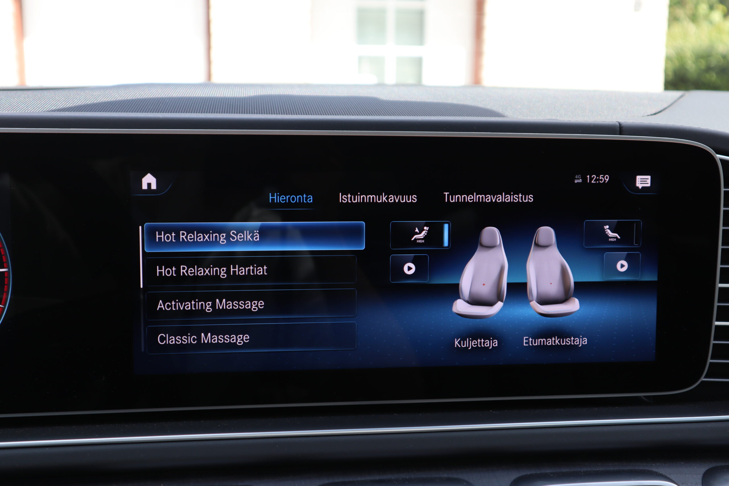 Koeajoauton suomenkielisen monitoiminäytön avulla on helppo tutustua siihen, mitä GLS:llä on tarjota. Tähän kannattaakin varata aikaa, sillä ominaisuudet ja säätömahdollisuudet eivät aivan heti lopu. Tarjonnan laajuudesta huolimatta näytön selkeydelle ja loogisille poluille voi antaa kiitosta, sillä niiden avulla ajoneuvosta saa vaivattomasti räätälöityä omien mieltymystensä mukaisen. Sanotaan ettei suomalaisia ohjekirjat kiinnosta, mutta GLS:n sähköinen maailma vie helposti mukanaan erilaisia vaihtoehtoja kokeillessa.