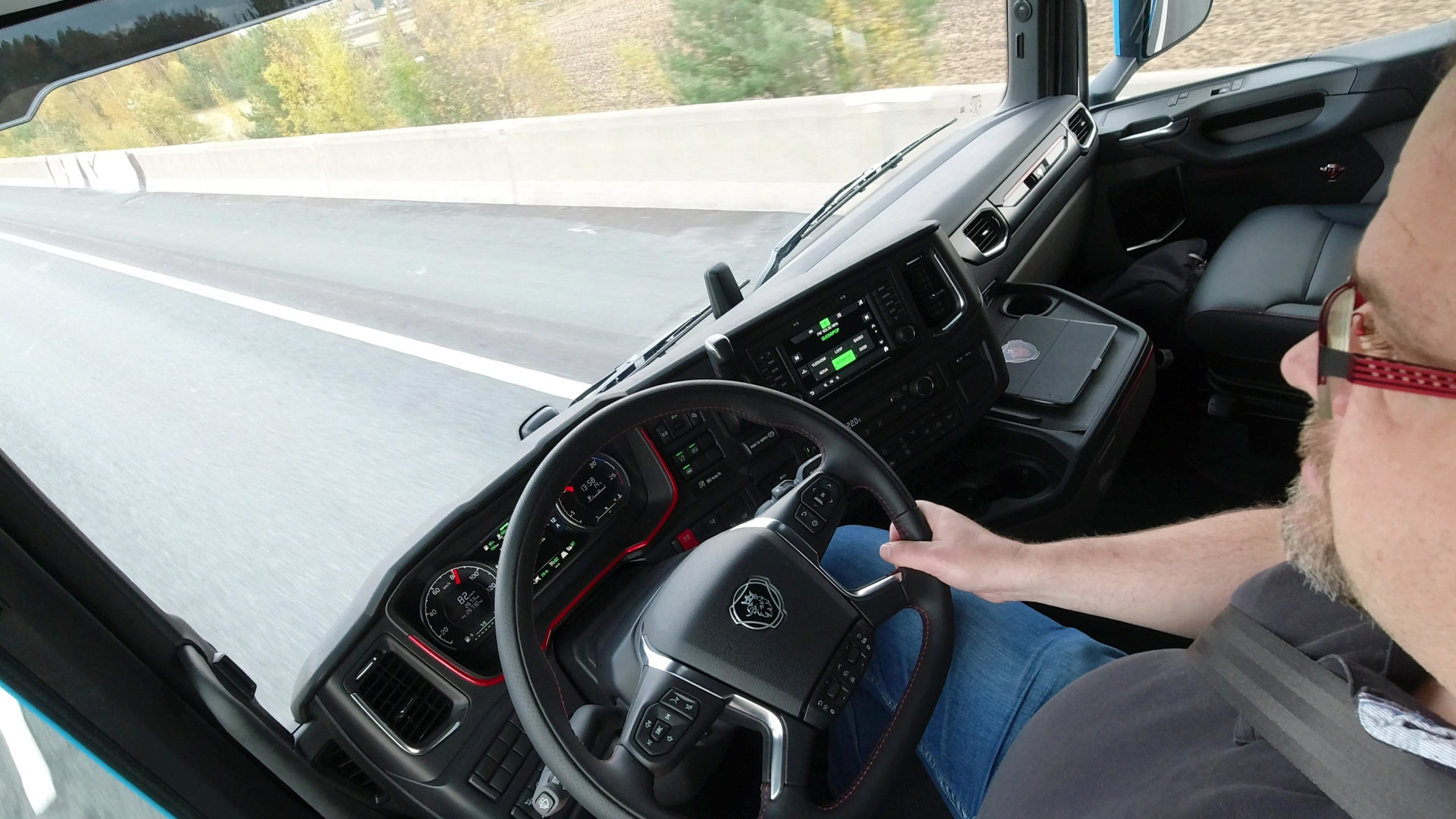 Ensimmäiset kilometrit, aina ensimmäiseen ylämäkeen saakka, sujuivat kuten millä hyvänsä uudella Scanialla. Hallintalaitteet ovat tutuilla paikoillaan ja sikäli ajatuksella suunniteltu, että Scanian rattiin on suhteellisen helppo tulla myös ensimmäistä kertaa.