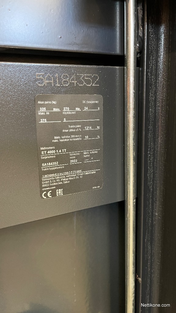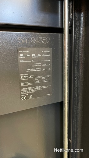 Kytkentätapa: Ei ilmoitettuValmistenumero: 5A184352Nostokyky: 1 400 kgNostokorkeus: 5 400 mmAjokorkeus: 2 370 mm