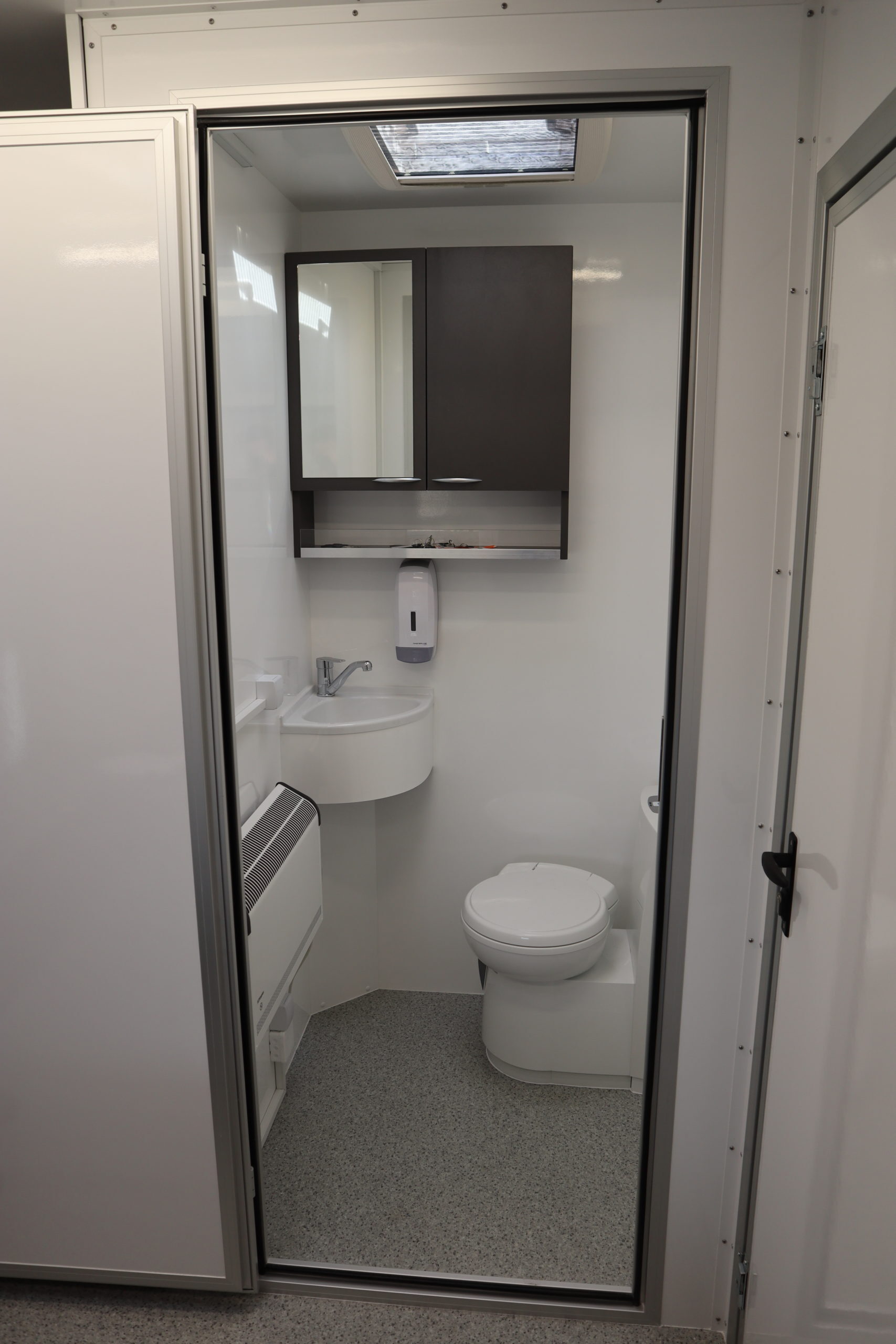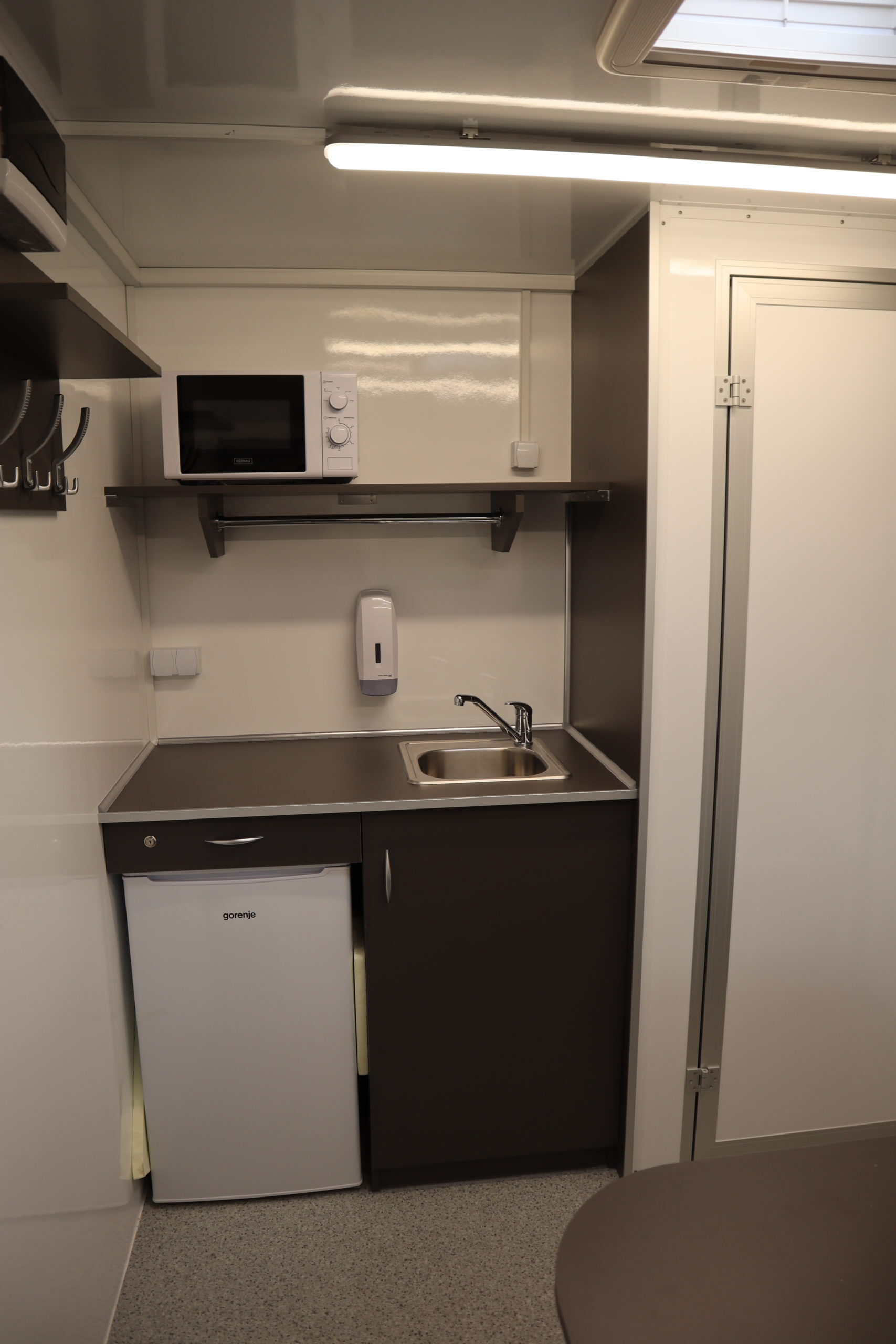 ”Keittiöosastossa on puolestaan mikrouuni, jääkaappi, pesuallas, lämminvesivaraaja ja saippua-automaatti. Kylpyhuonetila on kunnon kokoinen ja varustettu kemiallisella WC:llä, pesualtaalla, peilikaapilla, kattoluukulla sekä saippua-automaatilla. Tilan koko ja eristyksen taso mahdollistaa haluttaessa myös suihkun asentamisen. Kaikki tilat ovat myös varustettu tehokkailla lämmittimillä, mikä pitää tilat kuivina ja työskentelyolosuhteet miellyttävinä”, lisää Alander.