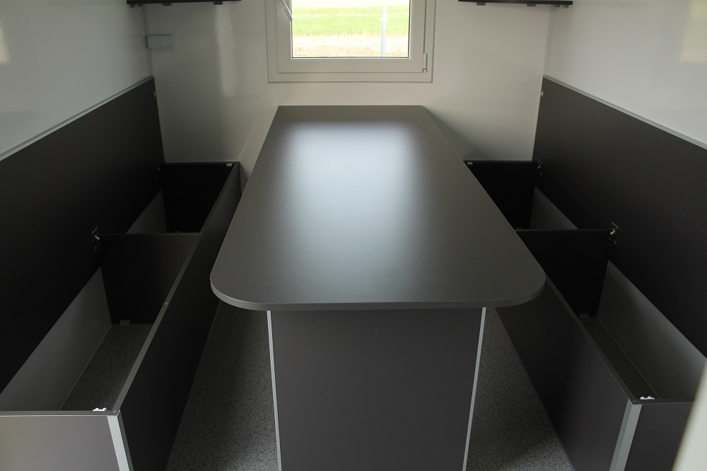 ”Suuri kysymys on toimisto-osan sekä varaston kokojen suhde ja kemiallisen WC:n tarve. Yleisessä ratkaisussa varastotilat ovat noin kuuden neliön kokoiset, mutta ratkaisu on tietenkin asiakkaan päätettävissä. Itse varasto on varustettu sidontakiskoilla ja -lenkeillä, taitettavalla työpöydällä, useilla sähköpisteillä, kunnon valaistuksella ja avattavalla kattoluukulla. Jämerät pariovet aukeavat riittävän leveästi, mikä mahdollistaa trukkilavan noston suoraan kyytiin”, korostaa Alander.