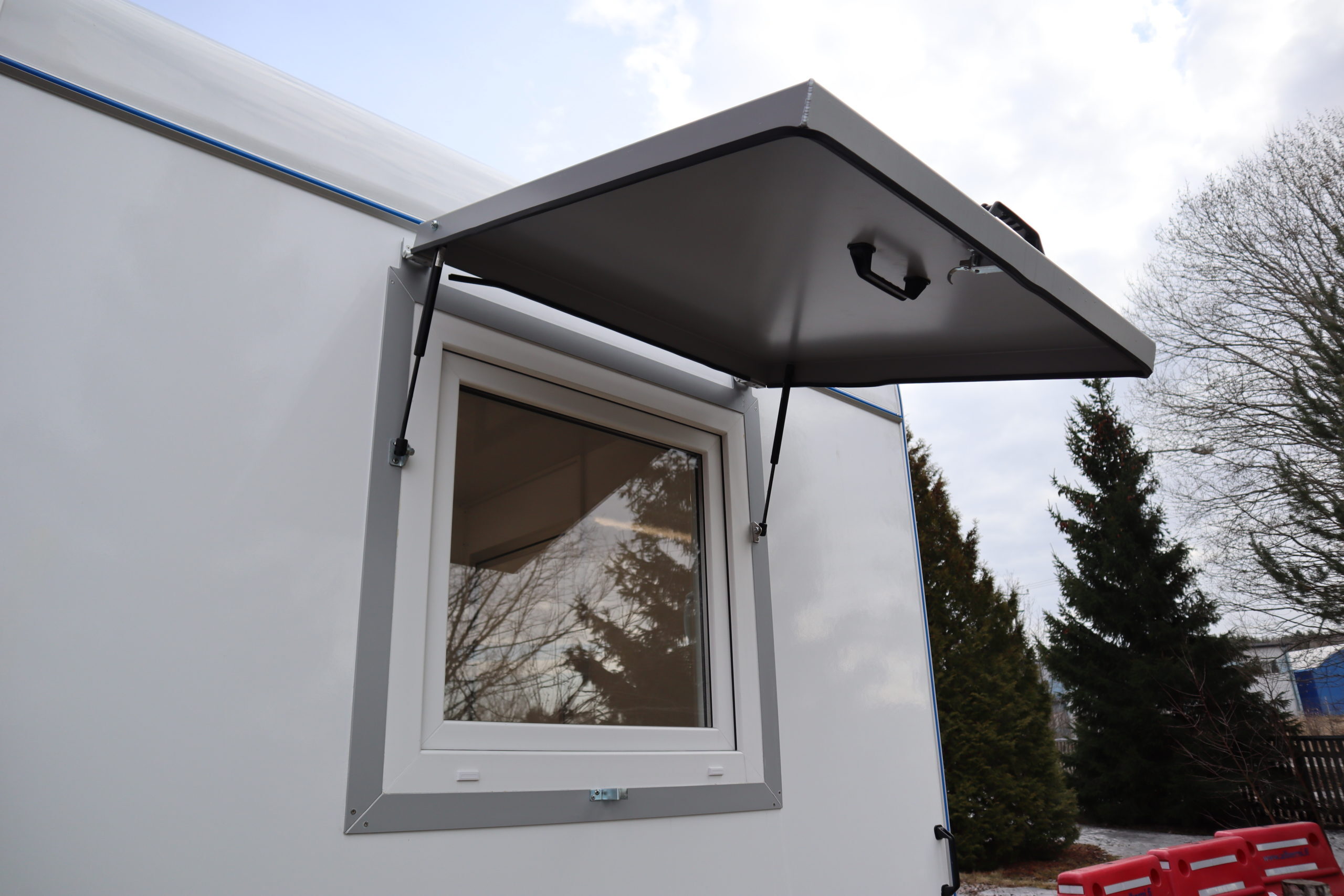 ”Kalusteet ovat jämerät ja kiinteät, istuinosien reunat on suojattu ja niiden alla on näppärä varastotila, hyllytilaa löytyy mukavasti. Naulakot on tehty kestämään raskaammatkin taakat. Luonnollisesti toimisto-osassa on runsaasti pistorasioita ja riittävä valaistus konttorityöt huomioiden. Luonnonvaloa saa puolestaan isosta avattavasta ikkunasta sekä kattoluukusta.”