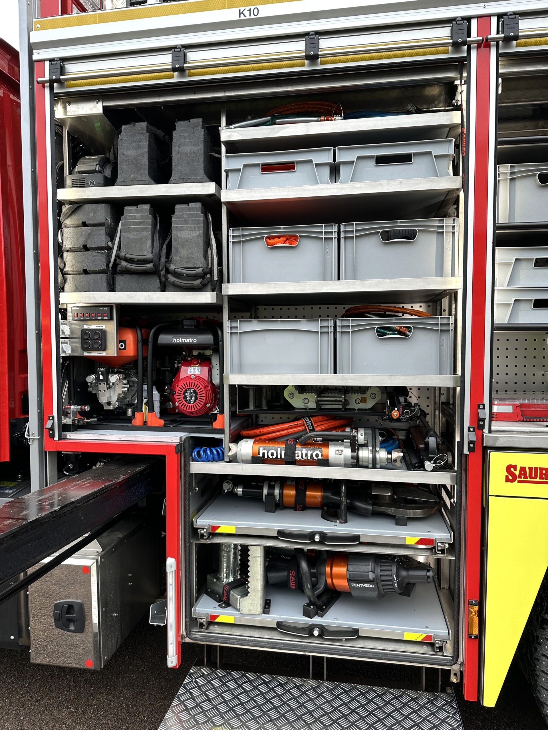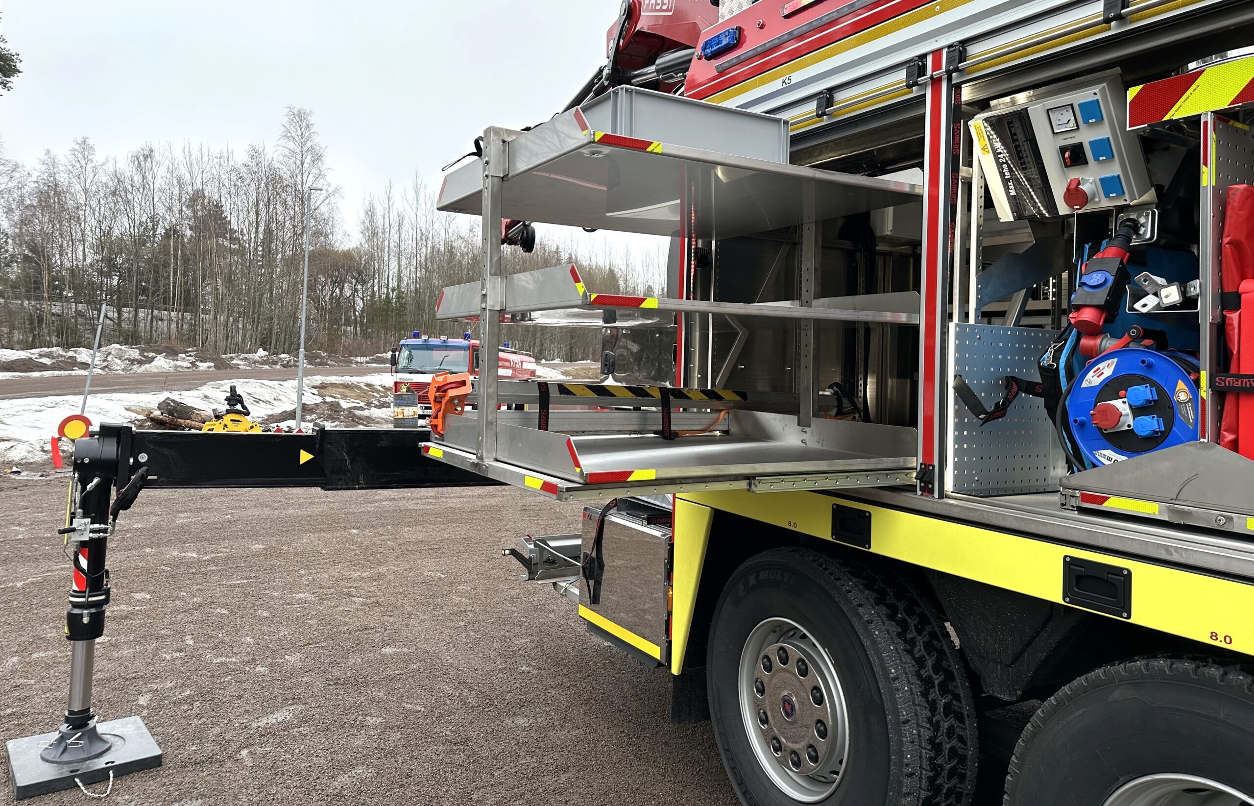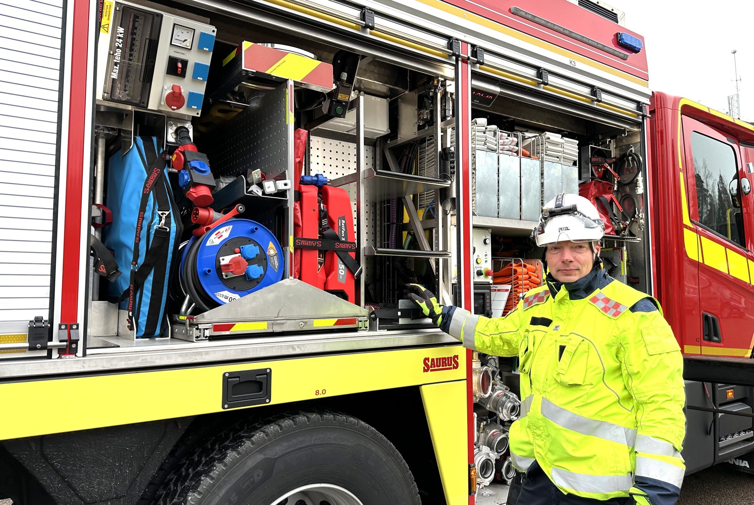 ”Tilankäytön maksimaalinen hyödyntäminen on luonnollisesti hyvin tärkeää, ja saman tehtävätyypin varusteet on sijoitettu samaan osaan ajoneuvoa. Koko auton pinta-ala on huomioitu ja katolle on sijoiteltu harvemmin tarvittavia varusteita, kuten esimerkiksi pintapelastuslautta. Kokonaisuus on osoittautunut hyvin toimivaksi, ja täytyykin antaa kiitosta Saurus-ajoneuvovarustajalle, joka osasi ottaa toiveemme tarkoin huomioon”, lisää palopäällikkö Asko Rouhiainen.