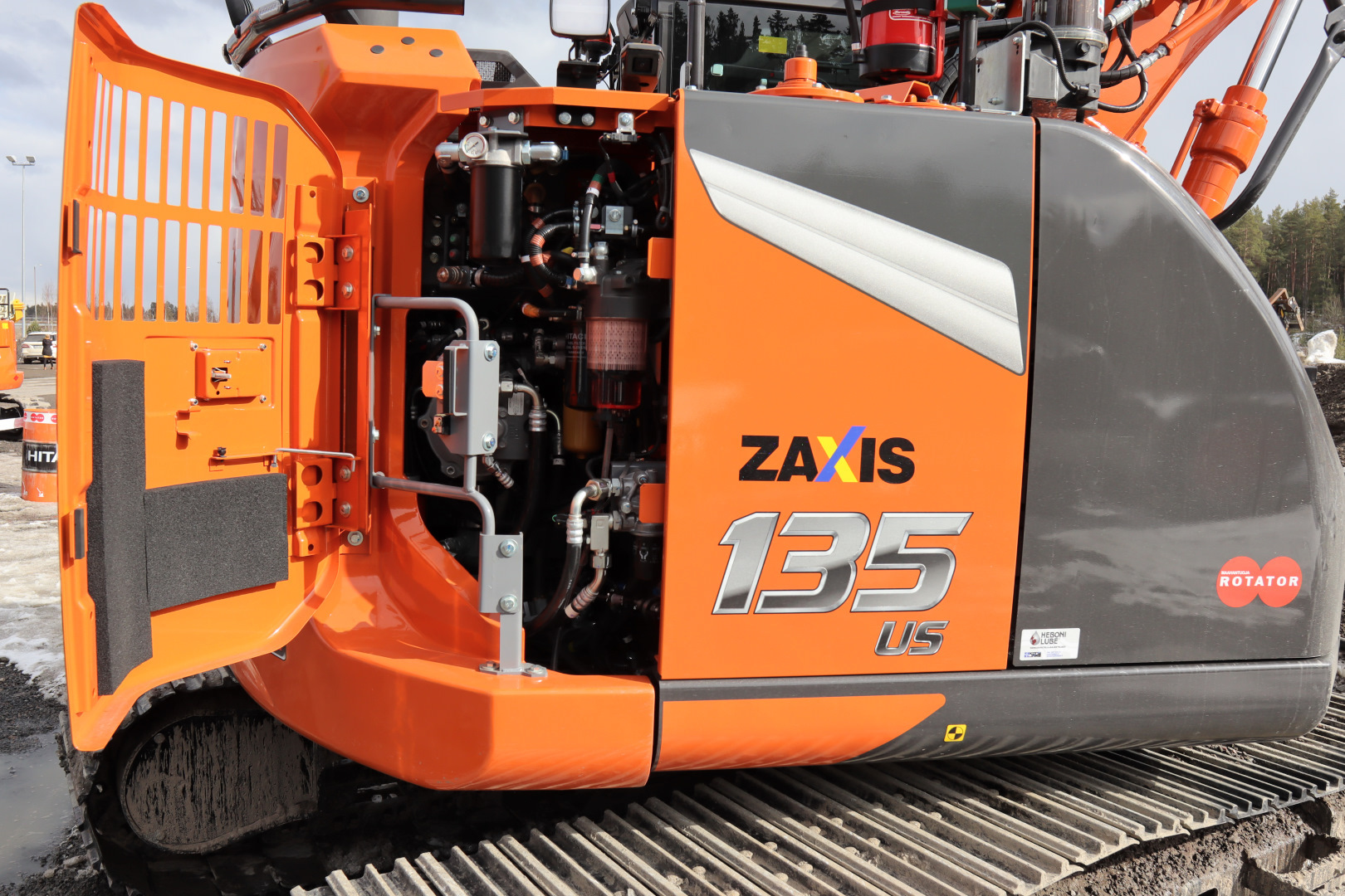 Ylläpidon helpottamiseksi uusi Hitachi ZX135US-7 on varustettu vakiona moottori- ja hydrauliikkaöljyn laadunseuranta-antureilla. Tieto epäpuhtauksista tai öljyn viskositeetin alenemisesta välittyy välittömästi koneen näytölle sekä pilvipalvelun kautta esimerkiksi valtuutetun huoltokorjaamon tietoon. Anturit sijaitsevat koneen oikean takakulman luukun takana. Saman luukun taakse on koottu suurin osa suodattimista. Niiden vaihto onnistuu tukevasti maassa seisten. Moottori-ilmansuodatin on puolestaan vasemman takakulman luukun takana myös helposti vaihdettavissa. Viereisten jäähdyttimien kennojen edessä ovat irrotettavat verkot, jotka suojaavat kennoja likaantumiselta. Verkot ovat kiinni rengassokilla, ja näin helposti irrotettavissa ja puhdistettavissa. Vasemman luukun takana on myös päävirtakytkin.