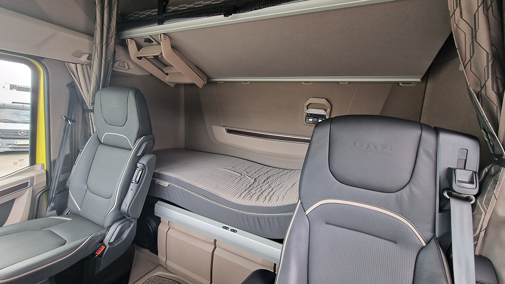 XF-ohjaamoa 33 senttimetriä pidemmässä XG:ssä alavuode on 80 cm leveä koko matkalta, ja silti kuljettajan istuin mahtuu liikkumaan reilusti pituussuunnassa. Tasalevyisellä vuoteella on helppo valita, kumpaan päähän tyynyn asettaa – tärkeä seikka, jos lepohetken parkkiruutu ei olekaan vaakasuorassa. Koeajoautossa alavuode oli sähköisesti säädettävä. Vuoteen alla on reilut säilytystilat, joihin voi valita jääkaappivarustuksen.