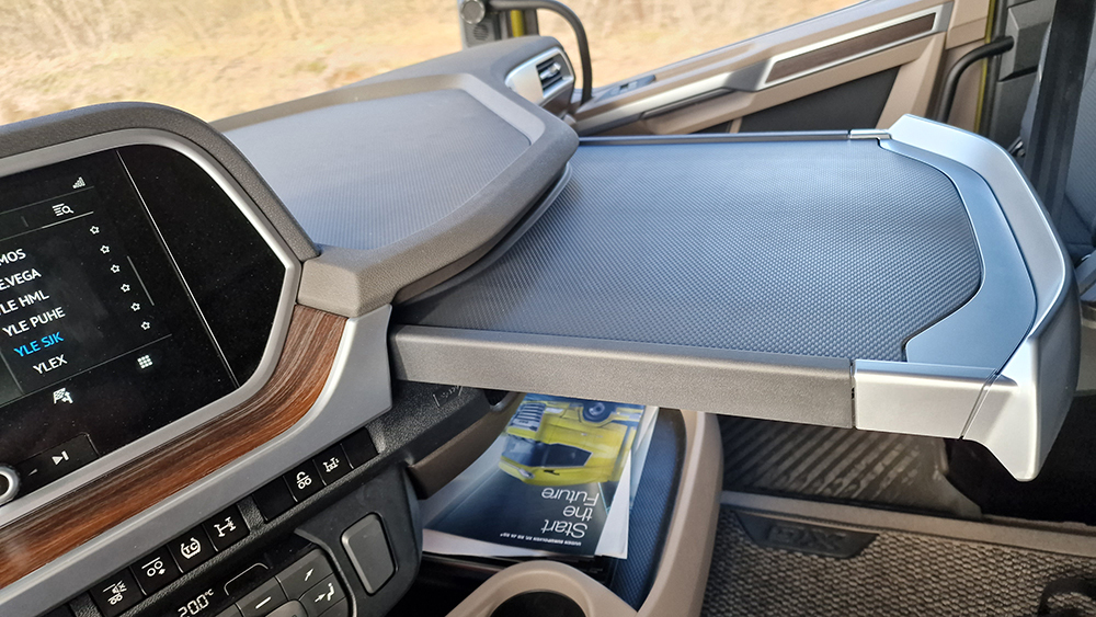 Yksi esimerkki kuljettajalähtöisestä suunnittelusta on pöytätaso, jonka saa vedettyä esiin kojelaudan keskeltä. Tukeva taso on toki tuttu jo edellisestä mallista.
