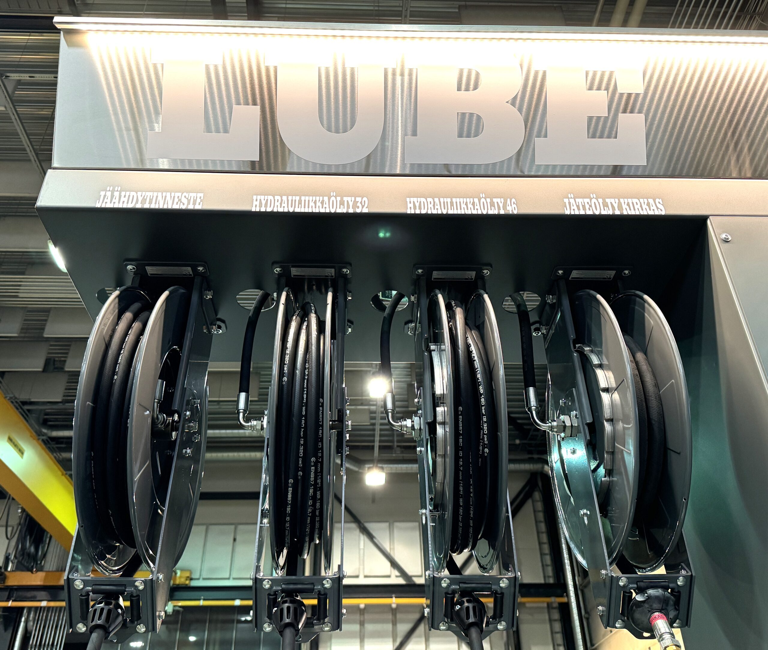”Meidän Lube Bar -yksikköömme kuuluu kaikkiaan kymmenen letkukelaa, joiden avulla käsitellään hydrauliöljyjä, jäähdytinnesteitä, jäteöljyjä, moottoriöljyjä sekä lasinpesunestettä. Lisäksi rasvarille on oma säiliö sekä kelansa ja konseptiin kuuluu myös 95 litran liikuteltava valutusallas, joka on näppärä tuoda tyhjennettäväksi imupumpun avulla Lube Barin luokse. Kaikki kelat ja pistoolit on merkitty tarkoin, mikä minimoi virheiden mahdollisuuden, ja letkujen 20 metrin pituus riittää hyvin meidän tiloissamme. Otimme järjestelmässä käyttöön myös Voitelukeskuksen yleisjäähdytysnesteen, joka käy kaikkiin koneisiimme ja lisää tietysti työn tehokkuutta.”