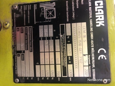 Clark CEM16SID 2464660.Electric lifter material handlingAd type For sale Category Forklift trucks Price without tax 4 750 € Location Helsinki, UusimaaVAT 25.5% 1 211 € Engine Electric Price 5 961 € Drive type Front wheel Year model 2001 Hours of use 5 121 h Registration number Not registered Last updated (24H) - Technical informationTrailer attachment: N/AMax lift power: 1 600 kgLift height: 4 950 mmDrive height: 2 190 mm