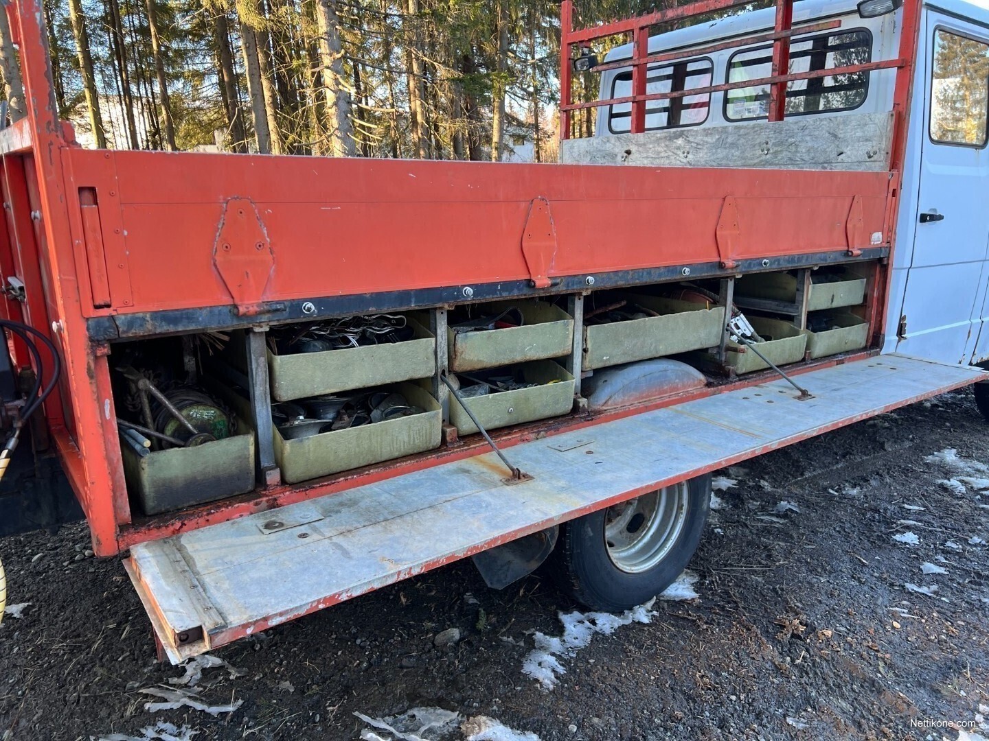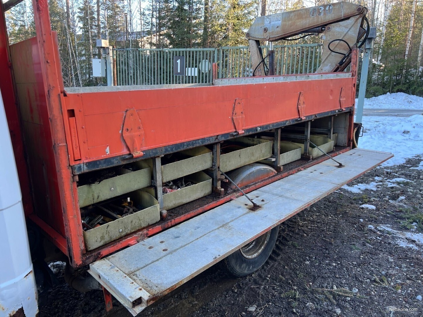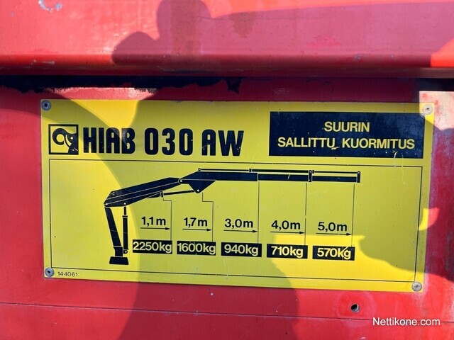 Nosturiauto tilavilla tavaralaatikostoilla, laidat lukittavissa. Nosturi Hiab 030AW ulottumaa 5 metriä.