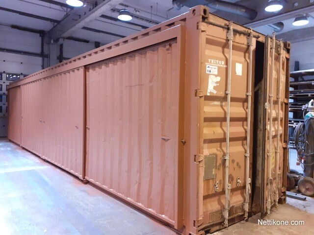 12 m kontti, 4 liukuovea toisella kyljellä, päädyssä pariovet. Vanerilattia. Sijainti Espoo.