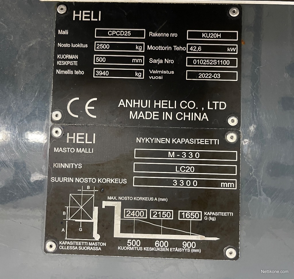 Teho: 43 Kw / 58 HvKytkentätapa: Ei ilmoitettuValmistenumero: 010252S1100Nostokyky: 2 500 kgNostokorkeus: 3 300 mmAjokorkeus: 2 150 mm