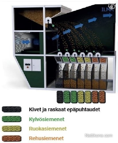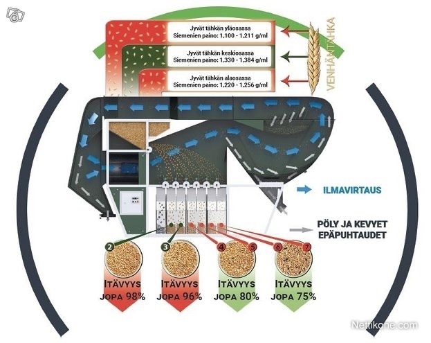 Aerodynaamiset ISM-erottelijat erottelevat siemenet ilmavirtauksessa niiden painon ja aerodynaamisten ominaisuuksien perusteella. *TEHOKAS SIEMENTEN PUHDISTUS. *KYLVETTÄVIEN ELINKYKYISTEN SIEMENTEN VALINTA. *HELPPO ASENTAA JA KÄYTTÄÄ ILMAN ERIKOISKOULUTUSTA. *EI SEULAA, EI LIIKKUVIA OSIA, EI HUOLTOTARPEITA. *NOPEA VAIHTO LAJIKKEESTA TOISEEN. *EDULLINEN HINTA JA MATALA ENERGIANKULUTUS. Viljanlajittelijalla ISM-5 on tarkoitettu kuivan siemenvi...Lue lisää »